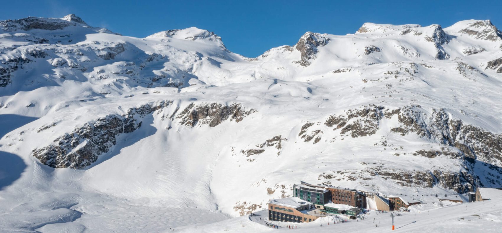 Snow-covered Mountains and Ski Resort Surrounded by Brilliant Blue Sky in the Alps.