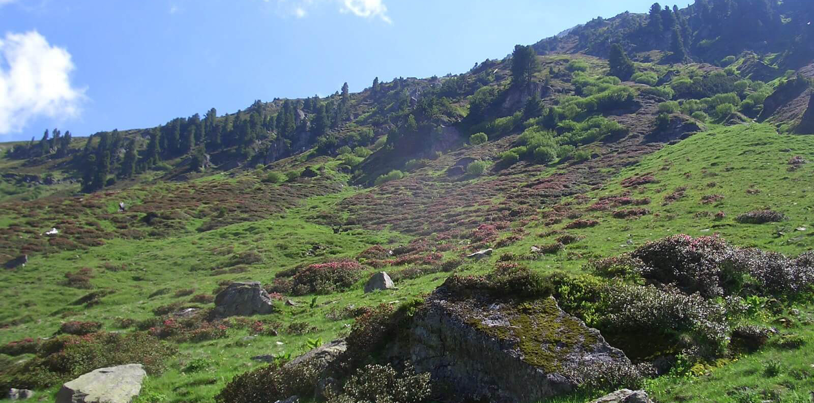 Berglandschaft mit grünen Wiesen, Felsen und Bäumen im Salzburger Land unter blauem Himmel.